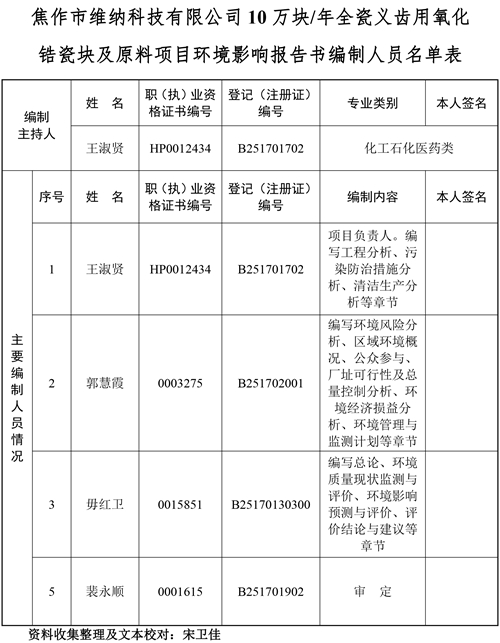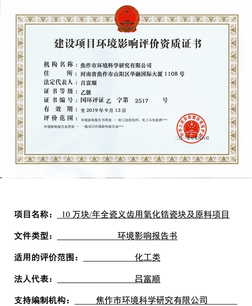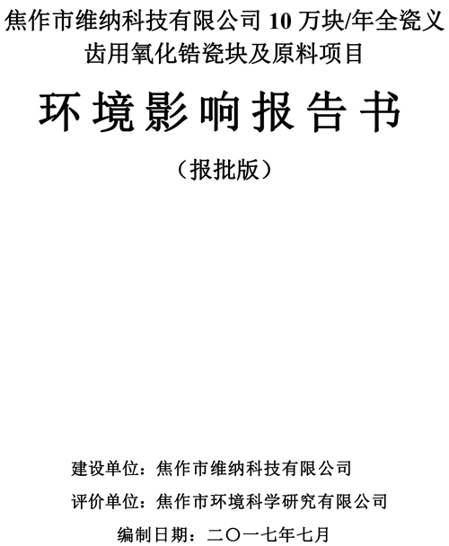 關(guān)于焦作市維納科技有限公司10萬(wàn)塊/年全瓷義齒用氧化鋯瓷塊及原料項(xiàng)目環(huán)評(píng)報(bào)告書(shū)信息公司。